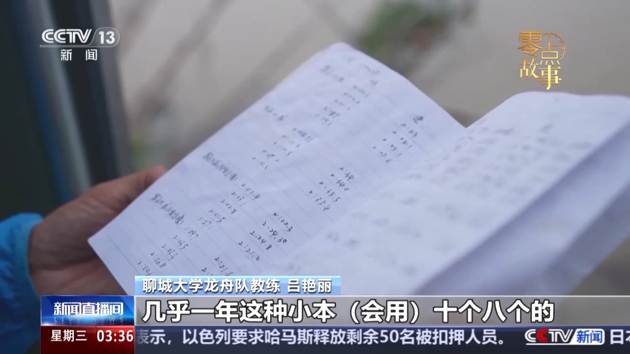 聊城大学龙舟队教练 吕艳丽:这个本子是日常笔记,这种就是随手记,出来两个月已经记了这么两本了。几乎一年这种小本会用十个八个的。