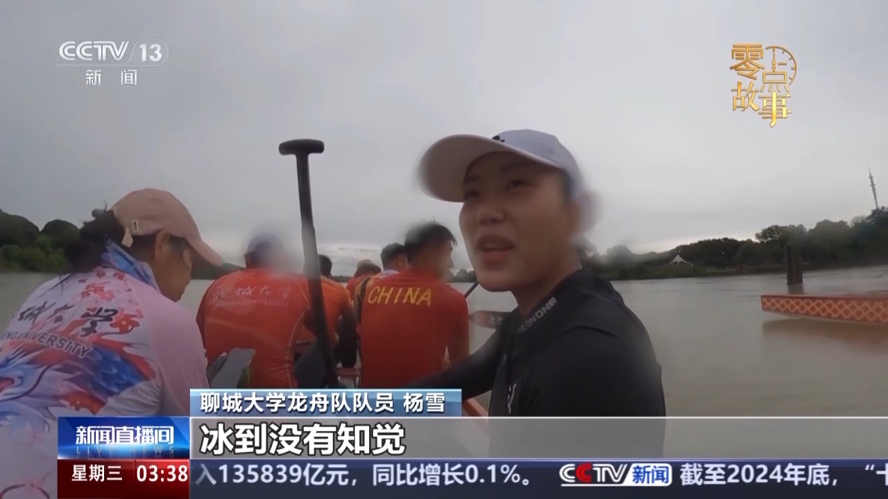 聊城大学龙舟队队员 杨雪:下着雪,手放到水里的话就很冰,冰到没有知觉,很痛苦。夏天的话热着也难受,反正没有容易的。