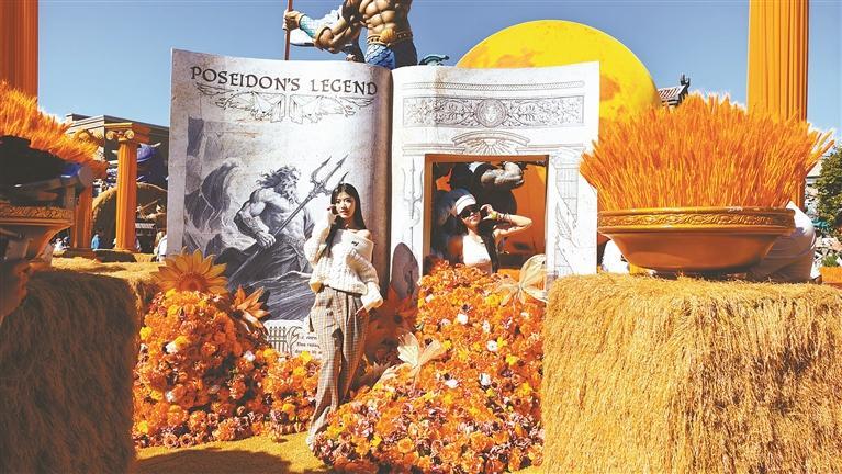 波塞冬旅游度假区的“凯旋狂欢节”人气爆棚。海底世界的“凯旋大巡游”一开场,海神波塞冬驾着铜蹄金鬃马车领航,虾兵蟹将、美人鱼演员紧随其后,西安游客王女士赶紧把孩子举到肩头:“孩子眼睛都看直了,一直问‘是不是真的海神来了’,这场景比动画片还精彩!”金色“稻浪迷宫”里,雅典娜NPC与游客互动合影,大学生小林笑着比出同款手势:“NPC的服饰和妆容太逼真了,发朋友圈后,朋友都以为我去了外地的主题乐园!”“双节”假期,该度假区客流同比上涨15%。