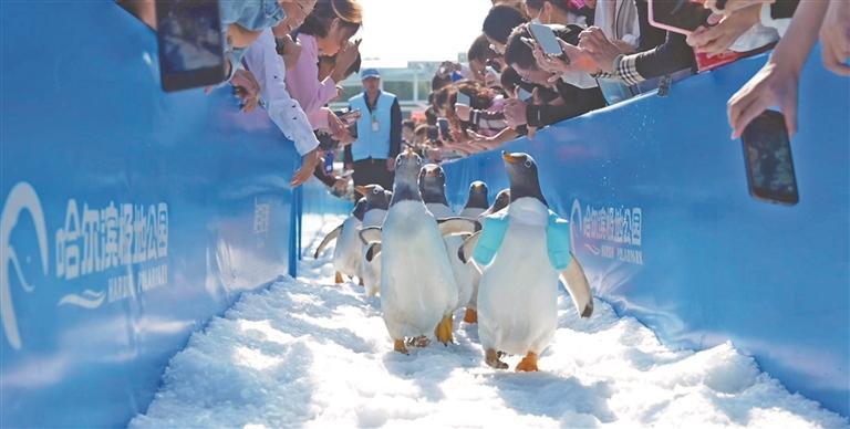 哈尔滨极地公园成为双节“顶流”,累计接待游客突破18万人次,同比增幅达120%,创下开业以来单日客流新高,以及单日客流同比最大增幅。景区“95后”创意团队打破季节限制,首次在金秋推出“淘学企鹅”国庆巡游,30余场免费巡游场场座无虚席。广州游客陈女士举着手机追拍摇摇摆摆的企鹅:“刷到视频就专程来打卡,孩子全程尖叫,这趟值了!”“淘学企鹅”相关话题全网曝光量超10亿次,“淘学企鹅国庆提前上班”登顶抖音同城榜Top1。此外,“极地献礼”系列表演同样吸睛:白鲸水下国庆特别版“海洋之心”中,保育员与白鲸共舞,红色画卷展开“我爱你中国”,全场游客齐唱《歌唱祖国》。来自北京的张先生眼眶微红:“看这样的爱国主题表演,特别感动,自豪感油然而生。”