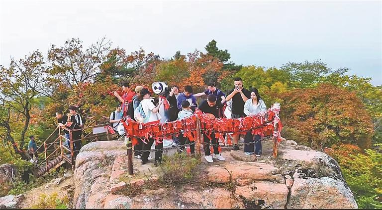 松峰山景区同样不甘示弱,登山步道上,满眼的秋色让人仿佛穿越千年。寻仙茶亭里,游人望着眼前的五花山——红枫似火、白桦鎏金、松柏凝翠,随手一拍都是美景。山脚下的树叶DIY体验区,孩子们用落叶拼贴出小鹿、蝴蝶,一位家长笑着说:“来之前以为只是爬山赏景,没想到还能动手做手工,就像进了大自然的课堂,能把秋天‘打包’带回家。”景区工作人员介绍,假期接待游客量已突破3万人次。